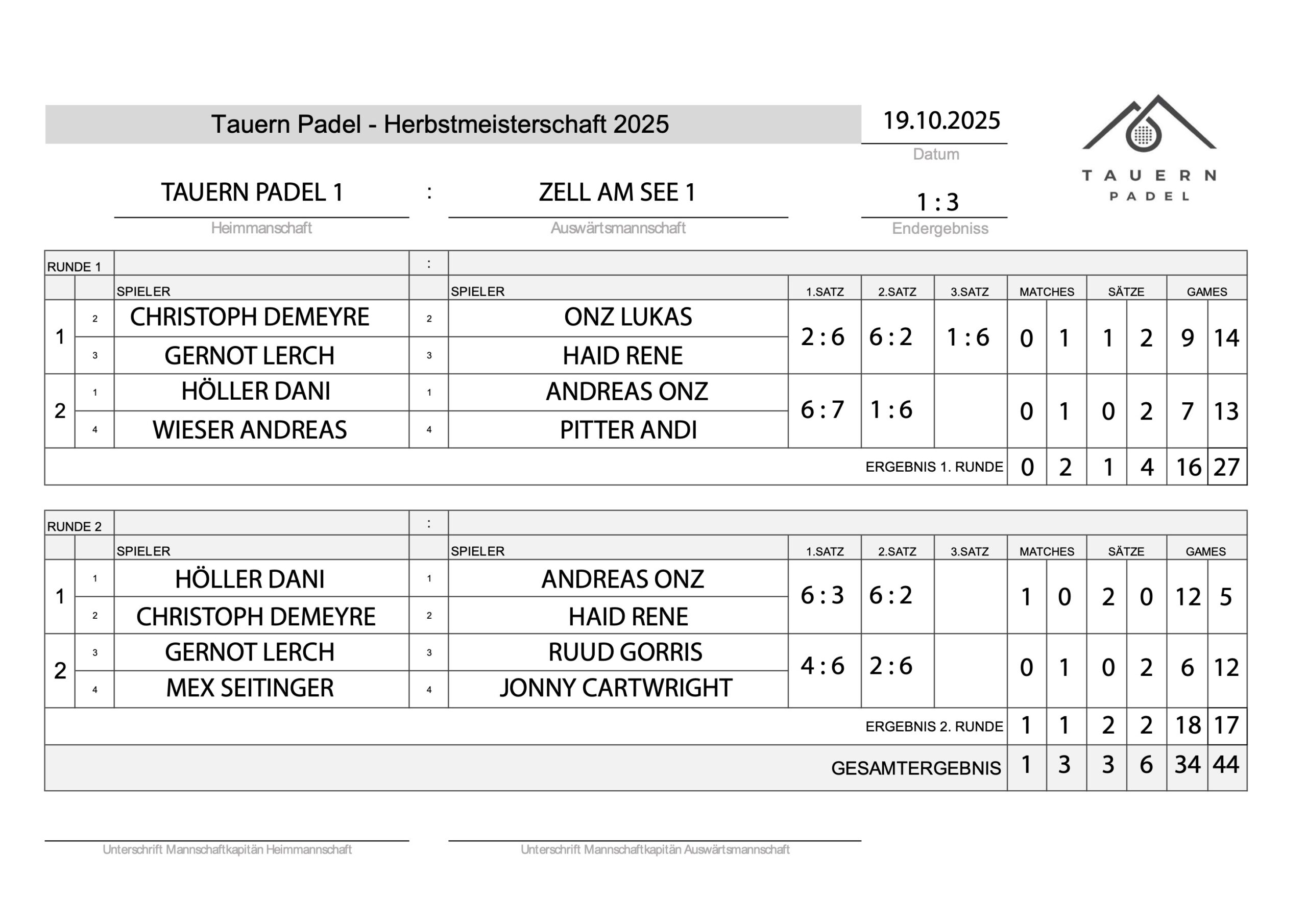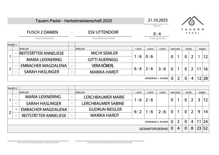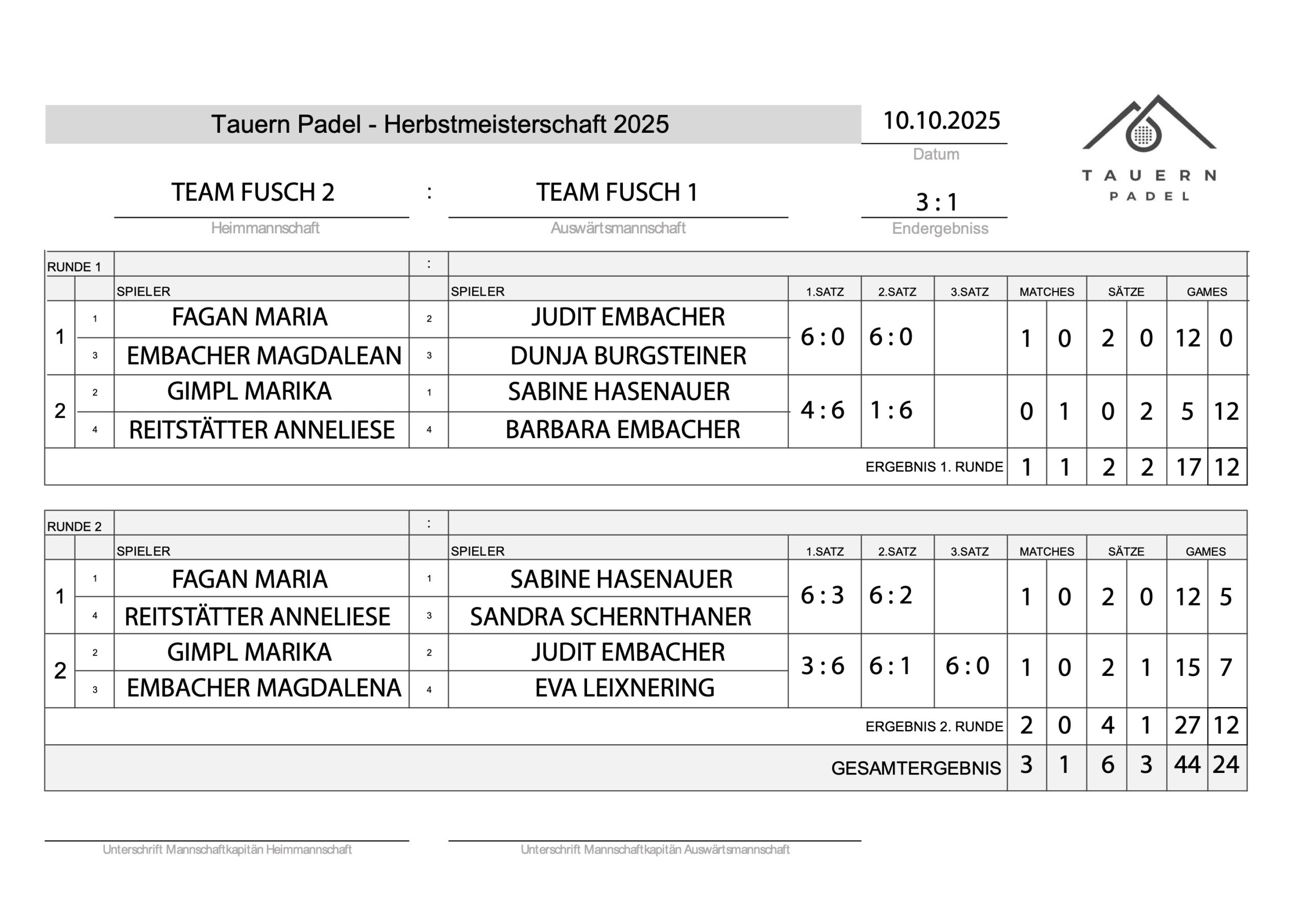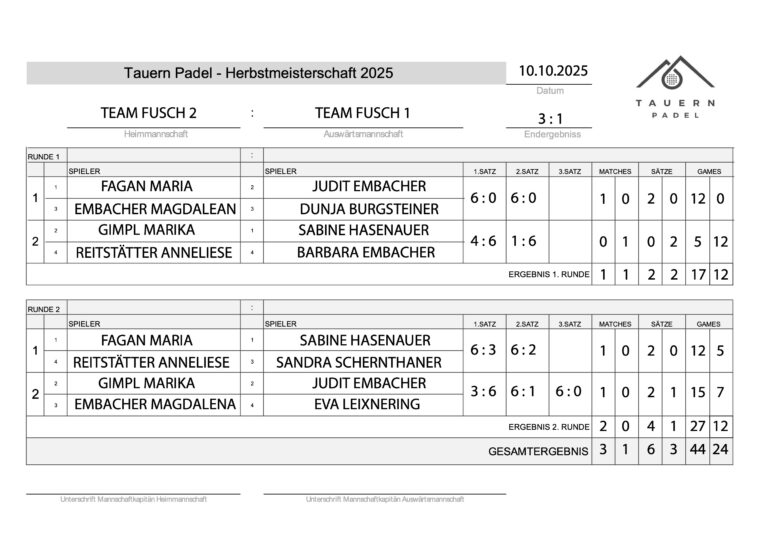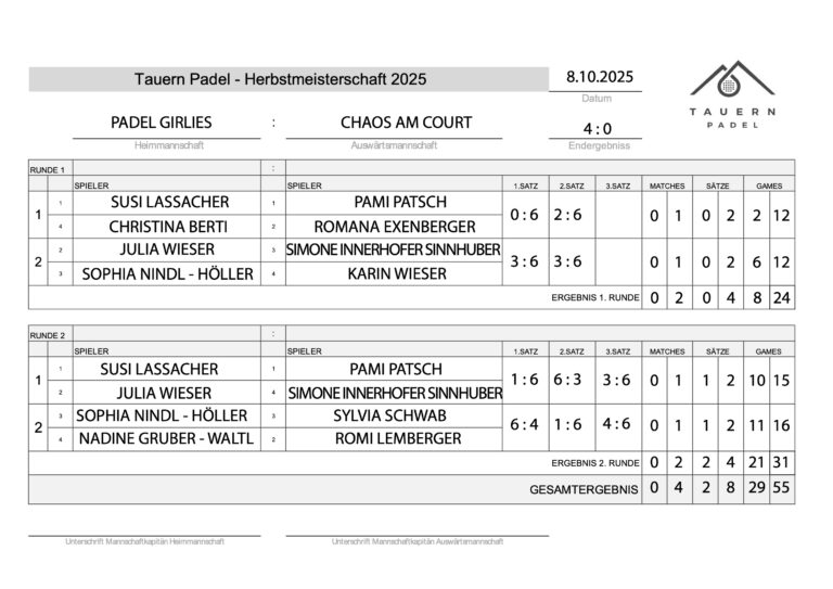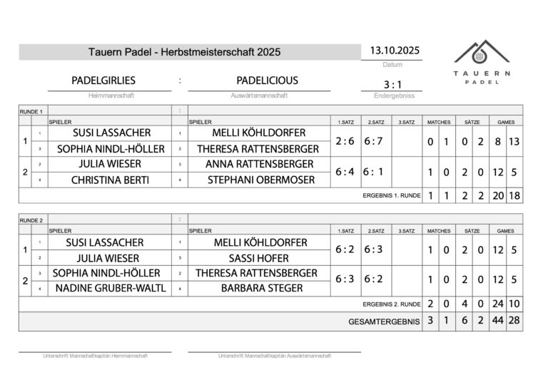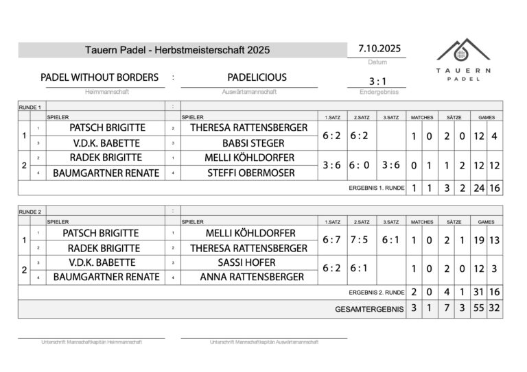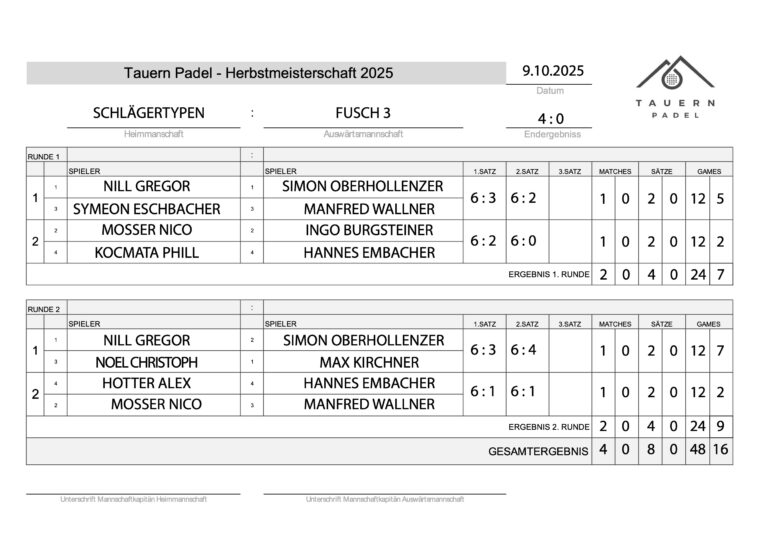 Hier findest du alle Spielberichte zur Tauern Padel Herbstmeisterschaft 2025.