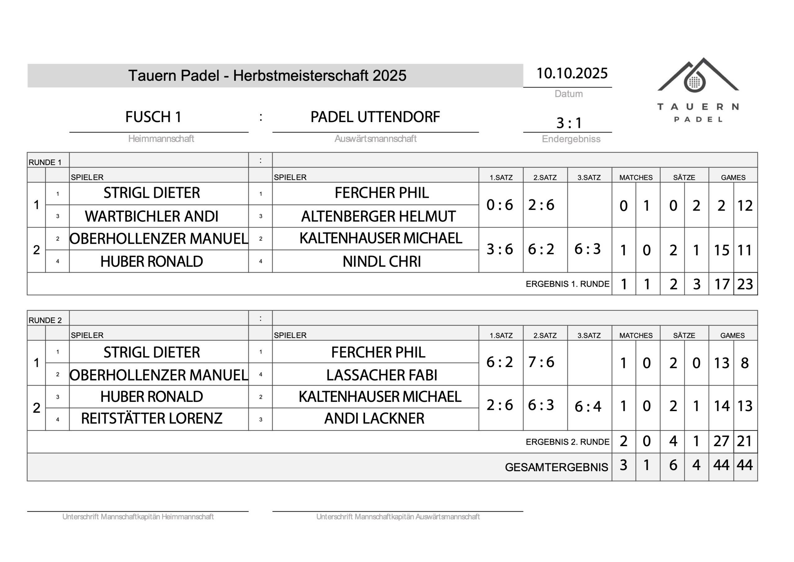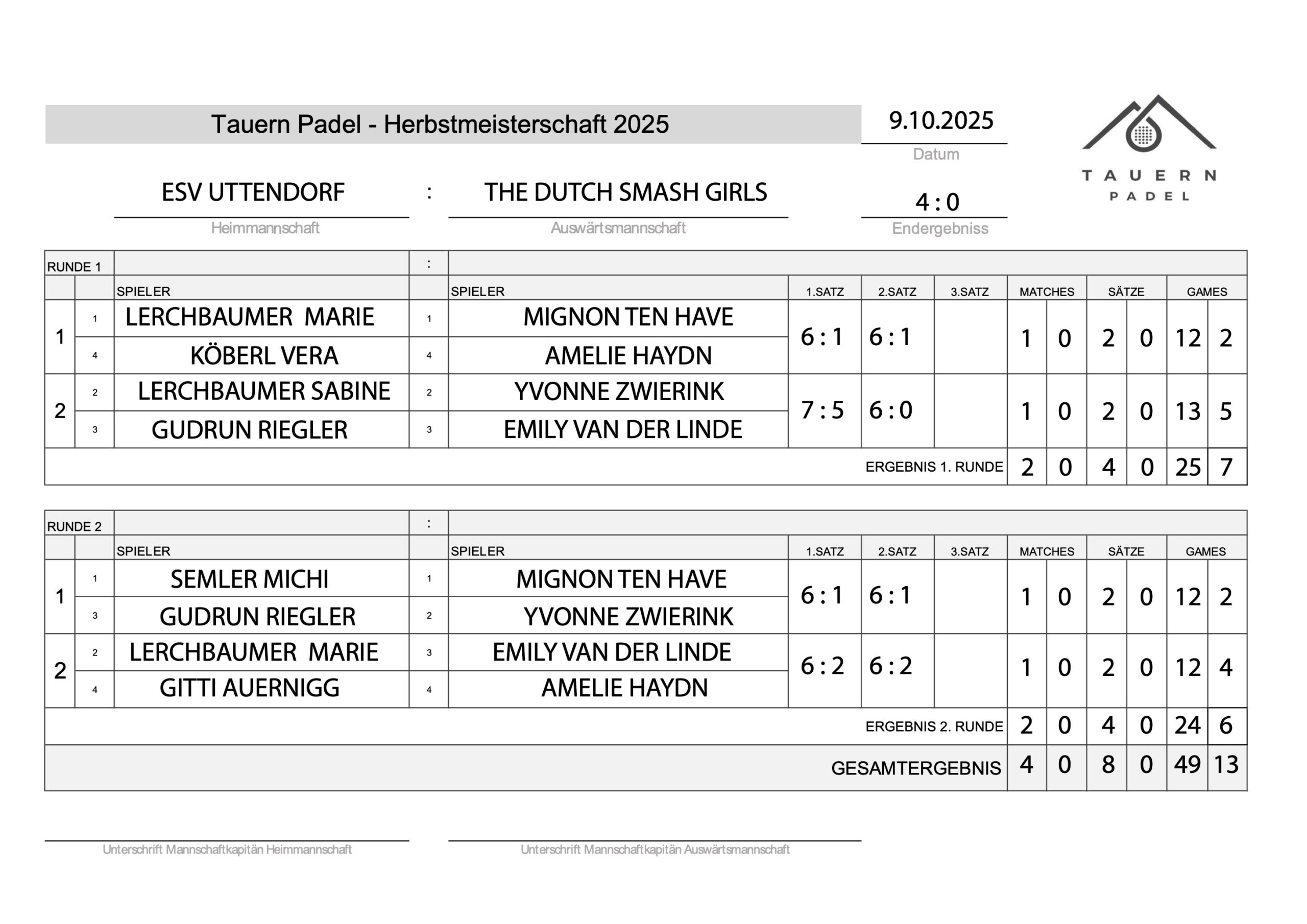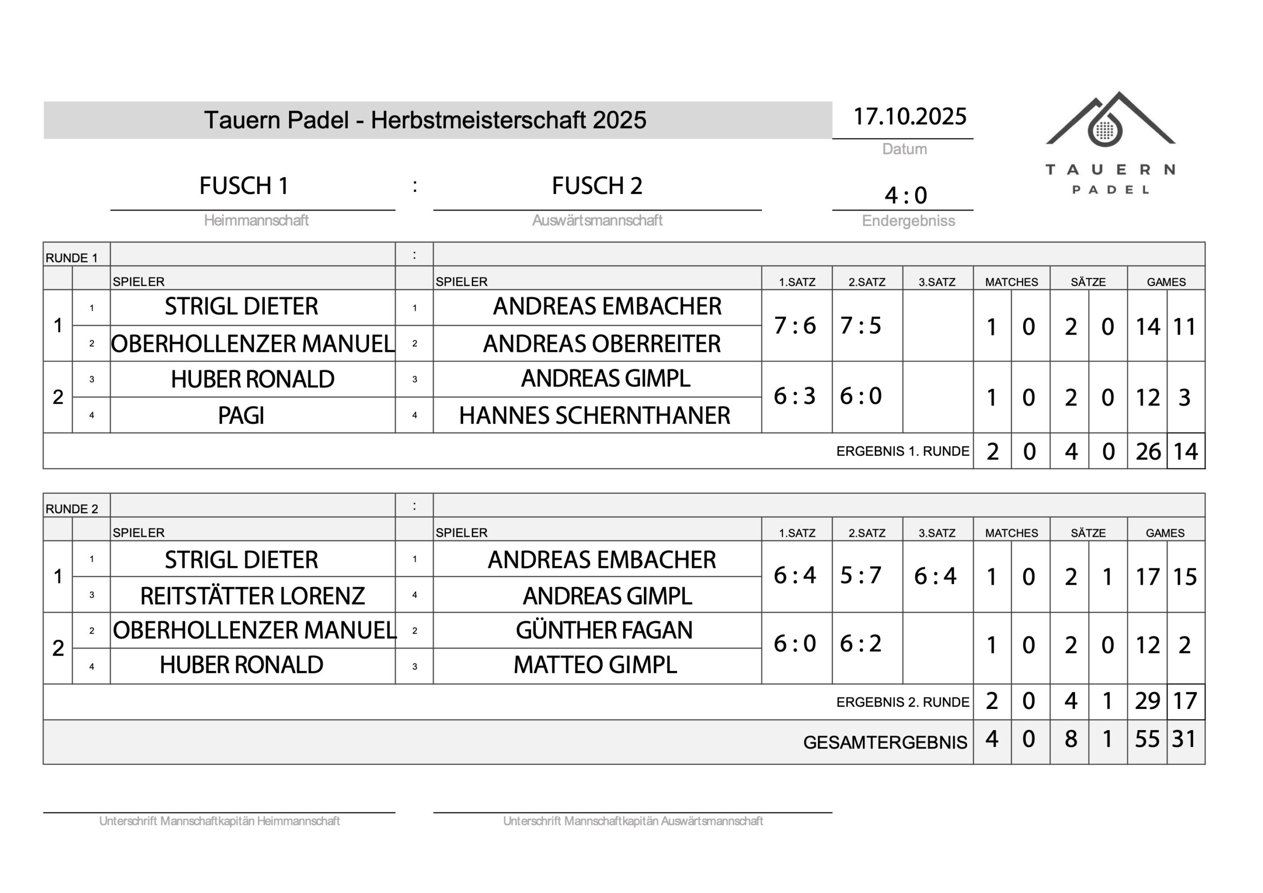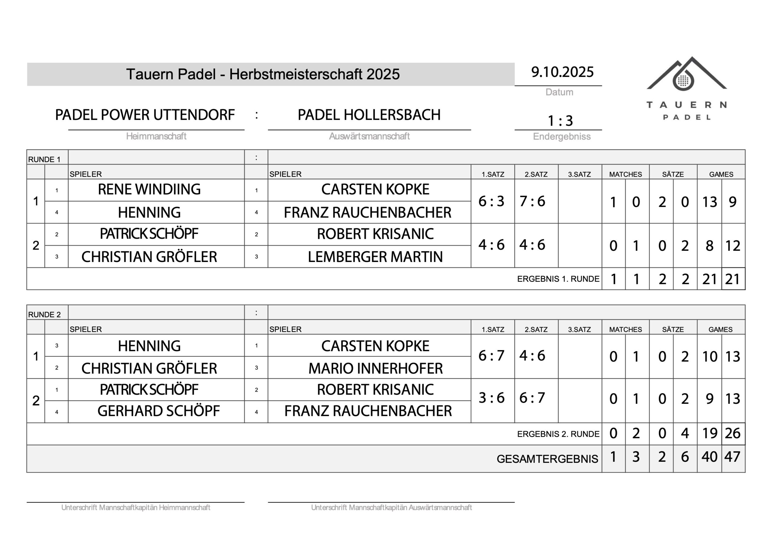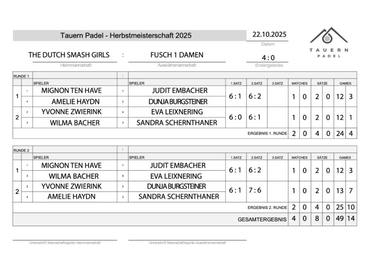 Hier findest du alle Spielberichte zur Tauern Padel Herbstmeisterschaft 2025.